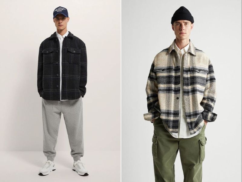 Áo thun trắng, khoác ngoài sơ mi flannel kẻ caro đỏ/đen – đúng vibe Giáng sinh.