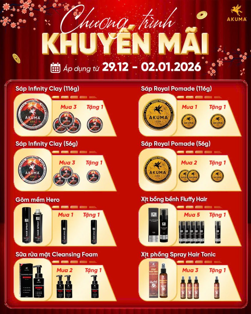 Nhân dịp cuối năm, AKUMA triển khai chương trình khuyến mãi cuối năm nhằm tri ân khách hàng và đối tác đã đồng hành cùng thương hiệu trong suốt thời gian qua. Chương trình mang đến nhiều ưu đãi thiết thực, giúp khách hàng dễ dàng tiếp cận các sản phẩm men-care và tạo kiểu tóc chất lượng cao với chi phí tiết kiệm hơn.